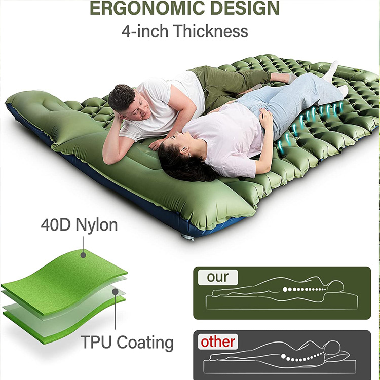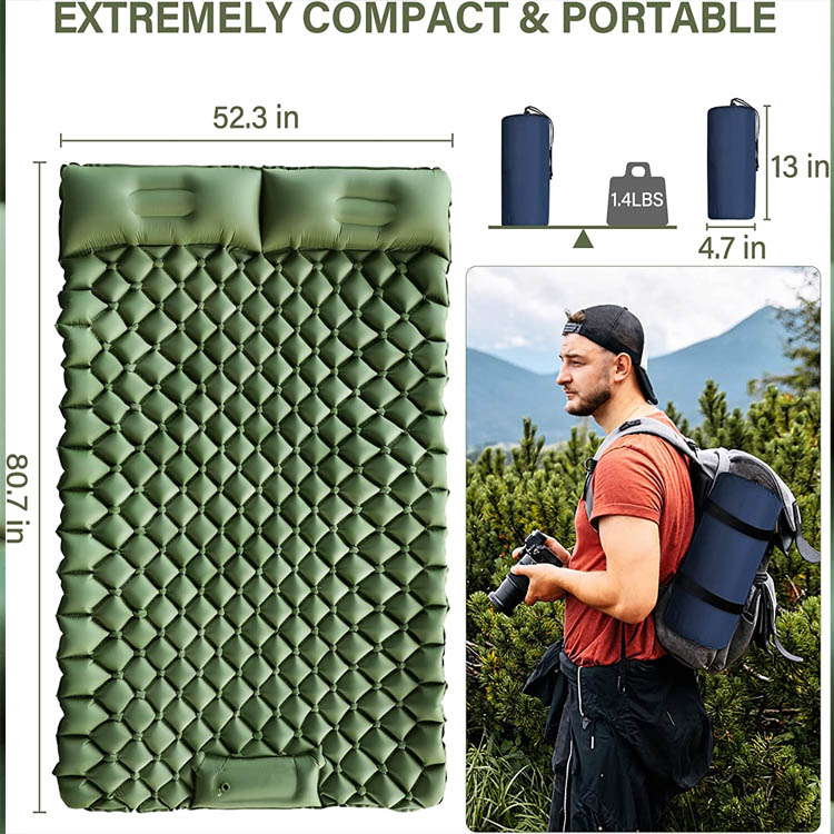 Pad de dormit de camping pentru două persoane. Pad gonflabil de camping. Confort dublu suprem pentru aventuri în aer liber. Acest tampon gonflabil de camping pentru două persoane oferă spațiu spațios de dormit, cu un design inovator de reținere a picioarelor pentru a preveni alunecarea. Ca o soluție ultra-ușoară, oferă portabilitate de neegalat și confort comun pentru cuplurile și prietenii de camping.