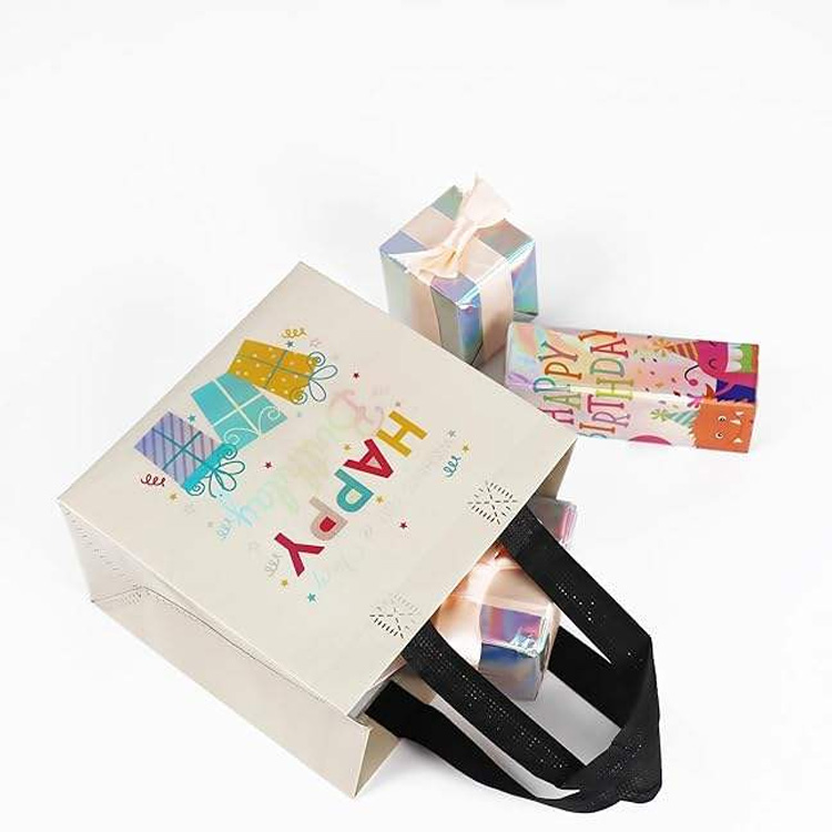 ✅Design vibrant și festiv – Fiecare geantă de ziua de naștere este imprimată frumos cu modele de cutii de cadouri colorate și text vesel „La mulți ani”, luminând instantaneu orice scenă de petrecere și punând cadourile în evidență.