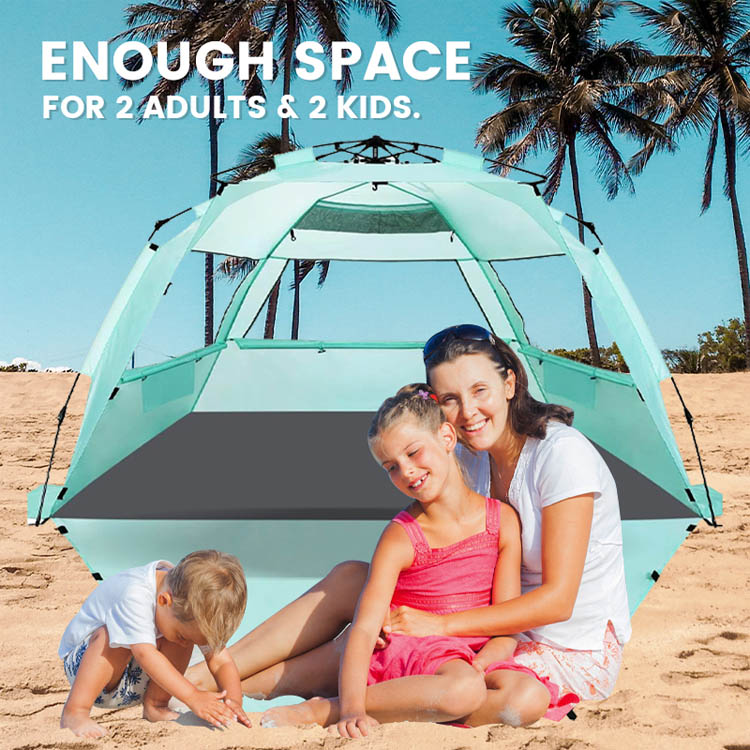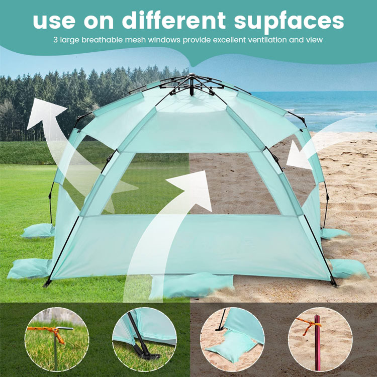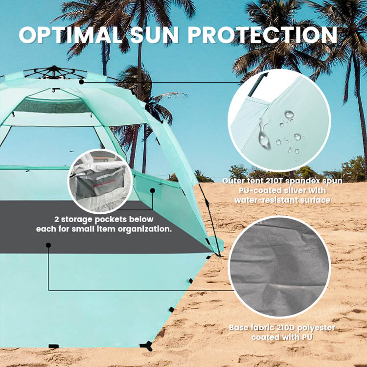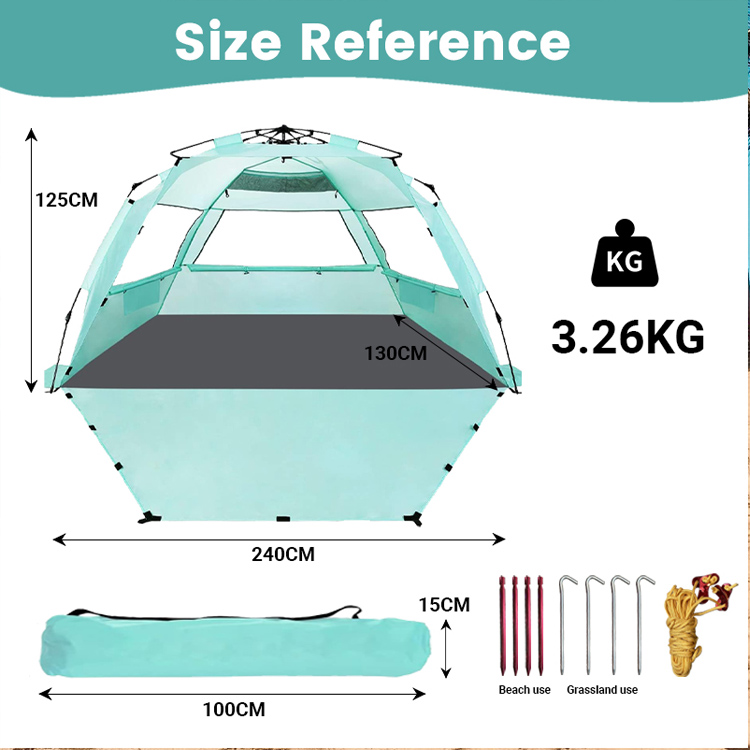 Cort de plajă pentru umbrire de soare din poliester, vrac, în vrac. Soluția ta de vânzare cu ridicata pentru protecția solară pe plajă. Acest cort ultraușor de umbrire din poliester are un design pliabil de tip pop-up convenabil. Perfect pentru utilizarea în vrac pe plajă în aer liber, combină implementarea ușoară cu acoperirea fiabilă a umbrei.
